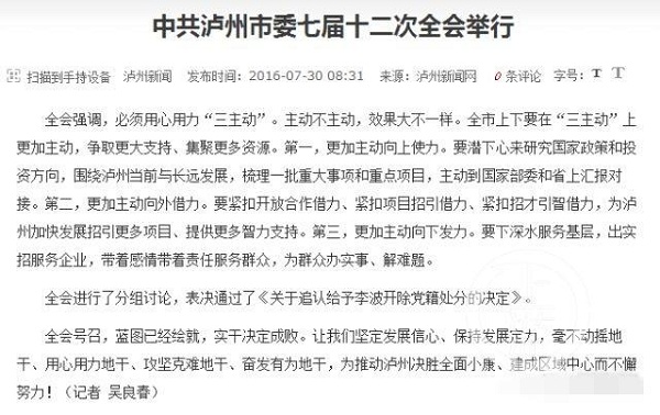 7月29日,瀘州市召開了市委七屆十二次全會,會議表決通過了《關(guān)于追認(rèn)給予李波開除黨籍處分的決定》。