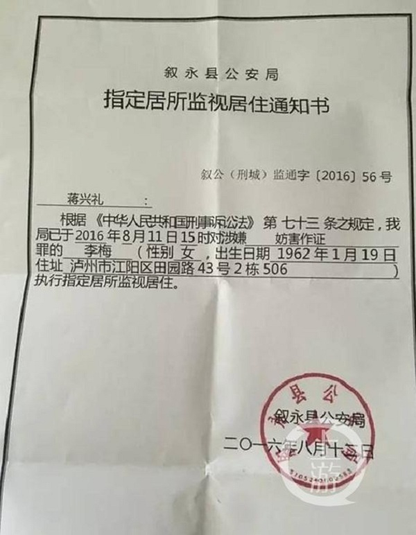 8月12日下午,李梅的家屬收到敘永縣公安局指定居所監(jiān)視居住的通知書,稱已于8月11日下午15時對涉嫌妨害作證罪的李梅執(zhí)行指定居所監(jiān)視居住。