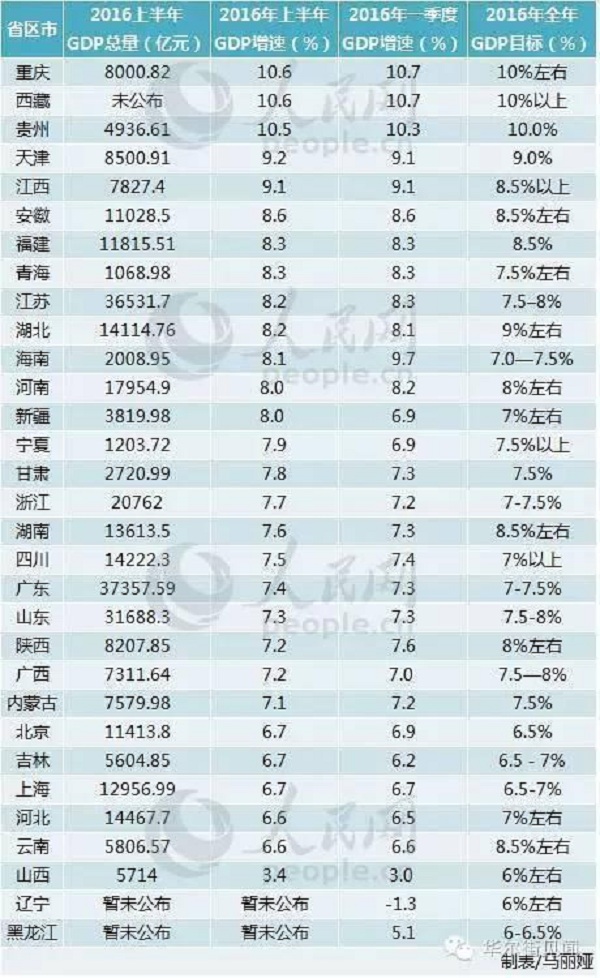 增速超過(guò)10%的重慶、西藏和貴州皆為西部地區(qū),國(guó)家信息中心經(jīng)濟(jì)預(yù)測(cè)部主任祝寶良認(rèn)為,增速高的主要是西南部一些地區(qū),而正在轉(zhuǎn)型的東部地區(qū)GDP增速放緩對(duì)全國(guó)整體經(jīng)濟(jì)的影響遠(yuǎn)大于西部地區(qū)。東部區(qū)域天津和江蘇分別以9.2%和8.2%的上半年GDP增速位列前十,但北京、上海、河北均未跑贏全國(guó)上半年GDP增速。