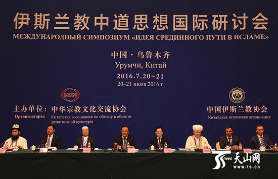 7月20日上午,伊斯蘭教中道思想國際研討會在烏魯木齊舉行。來自中國、俄羅斯、哈薩克斯坦、塔吉克斯坦、吉爾吉斯斯坦、烏茲別克斯坦6國的知名伊斯蘭教界人士、著名專家學者和政府官員近百名代表參加會議。????