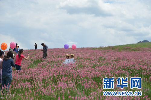 游客在石人溝花海游玩。(新華社 顧煜 攝)
