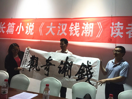 在讀者見面會上,楊軍向大家介紹了個人的創(chuàng)作經(jīng)歷以及作品情況,并向讀者代表贈送了新出版的《大漢錢潮》。著名朗誦藝術(shù)家凌江、曲波現(xiàn)場朗誦了小說片段,引起大家熱烈地掌聲。陜西金融工委副主任、陜西金融文聯(lián)常務(wù)副主席趙乾軍到會并講話,他代表陜西金融工會和金融文聯(lián),對《大漢錢潮》小說的出版表示衷心的祝賀,他說:“長篇小說《大漢錢潮》的出版,不僅是文學(xué)界更是金融界的一件大事,楊軍利用業(yè)余時間,多年堅持辛勤耕耘,在干好工作的同時,文學(xué)創(chuàng)作也取得豐碩的成果,是金融作家的典范,這種對文學(xué)事業(yè)的執(zhí)著精神值得作家們學(xué)習(xí)。希望楊軍繼續(xù)努力,多出精品力作!同時代表金融工會表示,支持陜西金融作協(xié)每年選擇一些代表性的作品召開研討會,促進(jìn)金融文學(xué)的繁榮和發(fā)展?!标兾魇∽鲄f(xié)副主席、著名作家王海談到:“《大漢錢潮》是一本好書,好就好在題材選得好,視角好,所以以獲得中國作家協(xié)會重點項目支持。業(yè)余作家創(chuàng)作不易,尤其創(chuàng)作這樣一部需要掌握很多知識的歷史題材長篇小說,前后創(chuàng)作時間達(dá)十余年,其中的付出可想而知。作為楊軍的鄉(xiāng)黨,我對他今天取得的成果表示祝賀。他在文學(xué)上的堅持精神讓我體會到:文學(xué)依然神圣!”咸陽市作家協(xié)會主席楊煥亭談到:“楊軍是一位勤奮的作家,也是我的好朋友,在創(chuàng)作這部作品時,由于與我的《漢武大帝》有交集,我們曾就有關(guān)問題進(jìn)行過交流。他很聰明,選擇了一個他最具優(yōu)勢的題材,他的目光不在于追索2000年前漢武帝怎樣搞幣制改革,而是將其置于我國人民幣國際化過程中面臨的諸多現(xiàn)實問題,如怎樣應(yīng)對通貨膨脹,怎樣反假和保持幣值的穩(wěn)定。其著眼點和文本價值都在當(dāng)下。這樣的探索和書寫,無疑是有意義的,即便放在全國,用小說手法展示漢武帝時期幣制改革這段歷史,在我看來,也是獨一無二的,值得祝賀!”陜西創(chuàng)意文化產(chǎn)業(yè)協(xié)會會長韓智平說:“長篇小說《大漢錢潮》,不僅是作者個人文學(xué)創(chuàng)作里程碑式的成果,也是陜西文學(xué)乃至中國金融文學(xué)的一項重大收獲,必將在中國文學(xué)史上留下濃墨重彩的獨特篇章。期待楊軍金融歷史題材三部曲第二部、第三部早日面世!”西安交大人文學(xué)院副教授姚明今,站在文學(xué)評論的角度,簡要評述了《大漢錢潮》的寫作得失,充分肯定了該書在還原漢代歷史、尤其是錢幣歷史細(xì)節(jié)方面所做的貢獻(xiàn),并因此而看好他未來的創(chuàng)作前景。陜西金融作協(xié)副主席程峰發(fā)言表示,楊軍作為作為協(xié)會主席,不僅自己帶頭創(chuàng)作,還帶領(lǐng)協(xié)會在短短的一年時間里取得了多項成果,實屬不易,并現(xiàn)場賦詩一首,值得慶賀。協(xié)會副主席吳群英談到,楊軍多才多藝,精力充沛,小說、詩歌、影視作品多面出擊,成績不俗,其勤奮和執(zhí)著,給陜西金融作家們帶了一個好頭,期待在不遠(yuǎn)的未來,帶給我們更多的驚喜!著名詩人、書畫家李曉恒則更看重作品中影視元素的充分運作和展示,認(rèn)為該小說與傳統(tǒng)歷史小說最大的不同或者說特色,在于有很強(qiáng)的畫面感,故事靠情節(jié)推動,結(jié)構(gòu)靠懸念抓人,而且通過錢幣反映歷史,角度很好,人物塑造個性鮮明,各具特色,看后印象深刻。