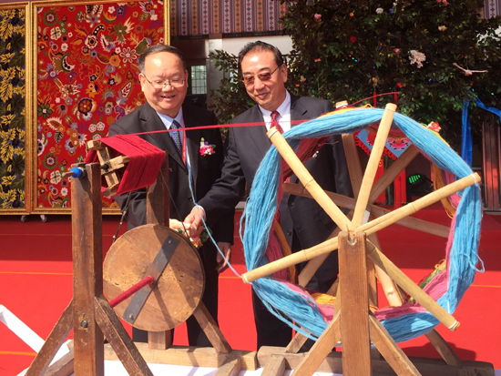 旦科、高勇共同搖動(dòng)藏毯紡紗車,啟動(dòng)這一世界藏毯盛典開幕。