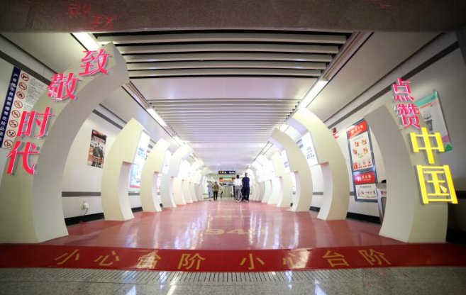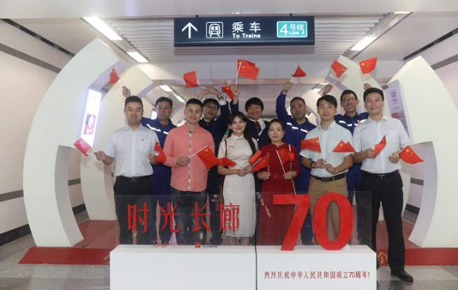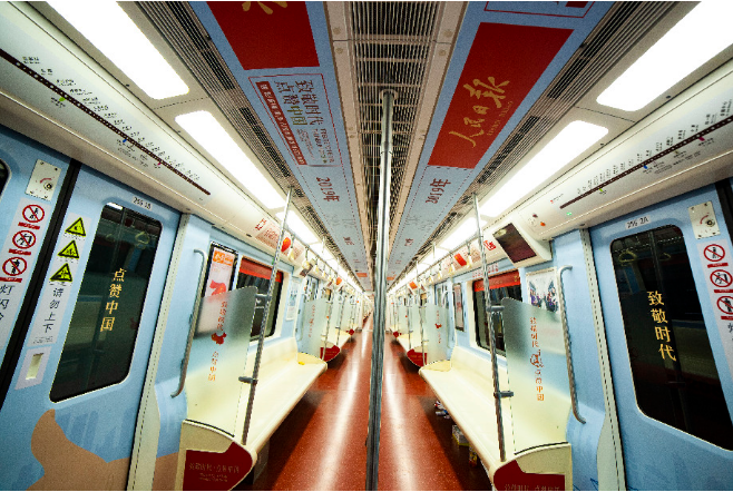 為慶祝中華人民共和國70周年華誕,人民日?qǐng)?bào)社陜西分社聯(lián)合西安市軌道交通集團(tuán)有限公司共同策劃在西安地鐵2號(hào)線推出“致敬時(shí)代·點(diǎn)贊中國”主題專列,并在行政中心站打造70周年主題車站。