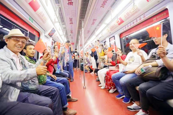 9月30日上午,地鐵二號(hào)線0225號(hào)專列載著上千號(hào)市民群眾和70年崢嶸歲月,穿行過新陜西、新西安,共祝祖國生日快樂。