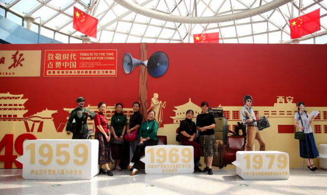 列車駛?cè)胄姓行恼?,一段時(shí)空長廊以新媒體技術(shù)手段展現(xiàn)在市民面前?!斑@是我們年輕時(shí)候最愛的打扮”,一位退休工人站在1969年的時(shí)光人像前激動(dòng)地讓老板給她拍照留念。