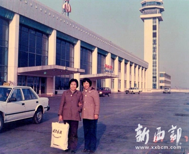 1987年3月7日,西北國棉一廠黨委副書記吳桂賢(左)、張鳳英(右)合影于北京機(jī)場。