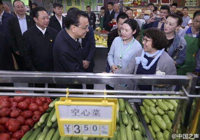 總理沿攤位不時停下細(xì)問店員各類蔬菜和豬肉價格變化,隨后對當(dāng)?shù)刎?fù)責(zé)人提出三點要求:一要保障農(nóng)產(chǎn)品供應(yīng)充足,二要保障食品安全,三要保障低保及低保邊緣困難群眾基本生活。