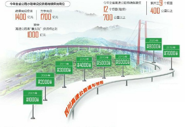 四川高速公路建設(shè)繼續(xù)加碼。4月1日召開的2020年全省交通運(yùn)輸工作會透露,今年將確保建成高速公路通車?yán)锍?00公里以上,全省高速公路建成里程將超過8000公里。