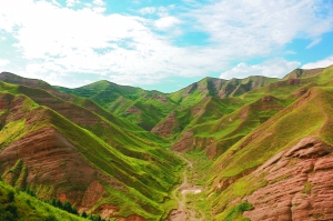 因?yàn)檫h(yuǎn)離城鎮(zhèn),所以這里一直都罕有人跡。座座群峰疊嶂,綠草幽幽。一條清澈的山泉水,從青草深處流出,一直流到了溝口。我們沿著泉水,逆流而上,一路驚起無數(shù)飛鳥、鳴蟲。山花爛漫,蝴蝶飛舞,大片大片野棉花最為引人注目,鵝黃色的花蕊鮮嫩可人,白白粉粉的花瓣,花瓣尖卻是凝聚了亮眼的深紅色。