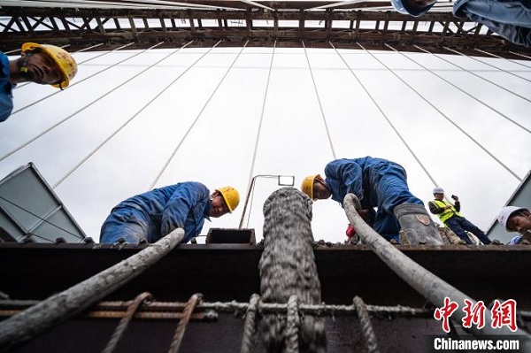 圖為6月20日,中鐵廣州工程局工人在藏木特大橋進(jìn)行合龍作業(yè)。 何蓬磊 攝