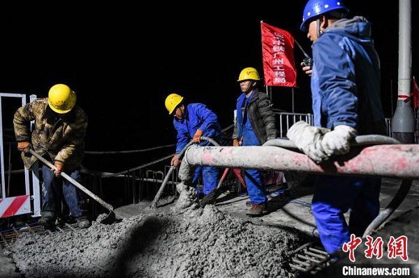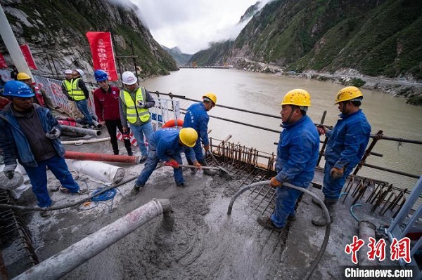 圖為6月20日,中鐵廣州工程局工人在藏木特大橋進(jìn)行混凝土澆筑作業(yè)。 何蓬磊 攝