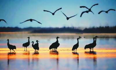 黑頸鶴在草海越冬的這4個月,和當?shù)鼐用窆餐袷刂案髯园埠?,互不打擾”的契約。每天傍晚,落日余暉中,一只只排好隊、撲棱著翅膀的鶴影從天邊掠過,降落淺灘嬉戲,待天空中最后一抹金色消失,1000多只黑頸鶴在四面環(huán)水的草墩、蘆葦叢休息。
