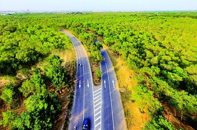 寧夏鹽池縣花馬湖生態(tài)水資源綜合項(xiàng)目區(qū)道路兩旁,曾經(jīng)光禿禿的大地如今綠蔭蔥蘢。光明圖片