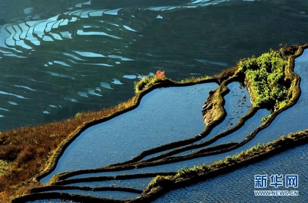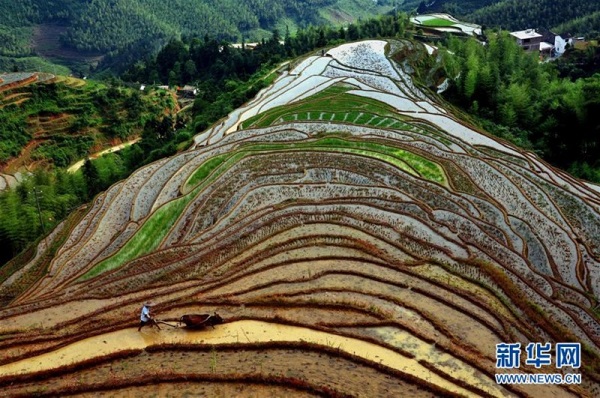 如今,梯田不僅是生存的載體,更已經成為一種獨特的旅游資源,被稱為“地球上最美的曲線”。尤其春天,站在山頂放眼望去,形狀各異的大小梯田盛滿清泉,縱橫交錯的田埂如蛛絲一般,農民們犁田、砌埂、削壁、灌水,一個個身影點綴在如鏡般的梯田水面上,構成了一幅秀麗壯觀、生機盎然的田園山水畫卷。