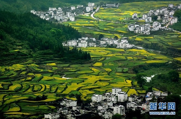 江西婺源江嶺梯田的油菜花海景區(qū)(2015年3月31日攝)