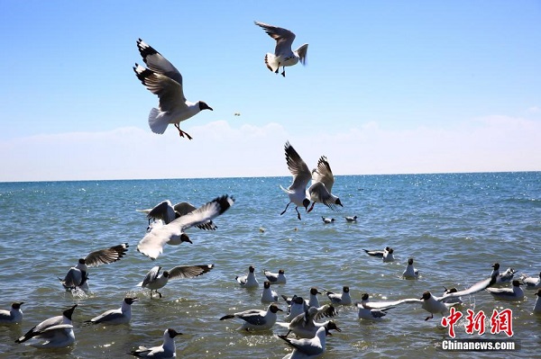3月24日,青海湖鳥島景區(qū),回歸的夏候鳥紅嘴鷗飛翔嬉戲。青海湖開湖分為“文開”和“武開”,2016年青海湖開湖屬“文開”?!拔拈_”是指封凍一冬的青海湖隨周邊氣溫升高,緩慢融化,而“武開”則為在猛烈季風(fēng)下,湖面冰層破裂被相互擠壓著推向岸邊。氣象資料顯示2016年青海湖開始解凍日期較去年推遲27天,較歷年開湖日期平均(2003~2015年)提前了8天。中新社 記者 羅云鵬 攝