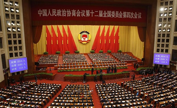 下午3時(shí),閉幕會開始。俞正聲宣布,中國人民政治協(xié)商會議第十二屆全國委員會第四次會議應(yīng)出席委員2214人,今天實(shí)到2101人,符合規(guī)定人數(shù)。