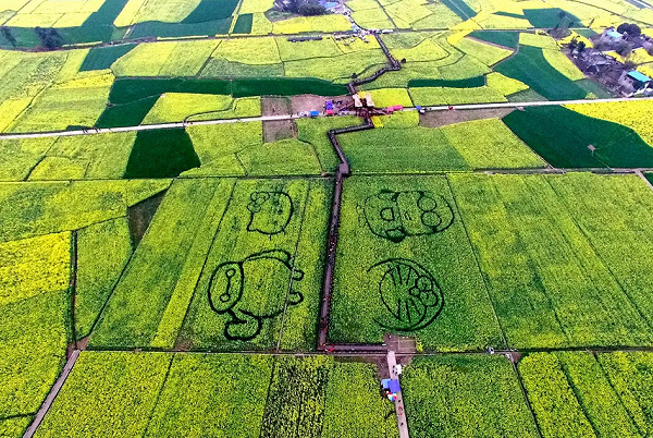 3月12日,四川廣安,在四川省廣漢市西高鎮(zhèn),大學(xué)生村官李嘉佳等人在油菜花田里“種”出的“機(jī)器貓”、“kitty貓”、“小黃人”、“大白”及“青銅大立人”等圖案,引來(lái)不少游客觀賞、拍照。