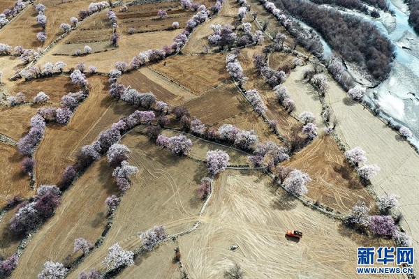 西藏林芝市波密縣境內(nèi)桃花盛開的田園風(fēng)光(無(wú)人機(jī)照片,2020年3月26日攝)。新華社記者 詹彥 攝