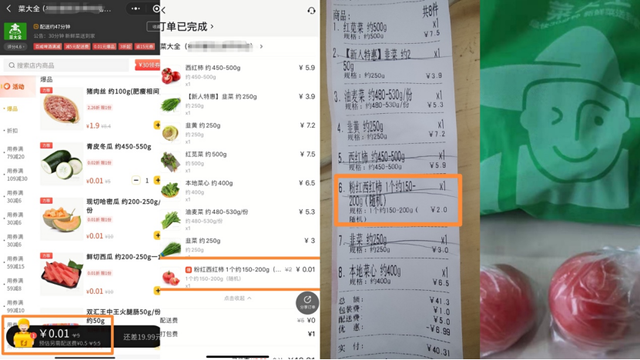 記者注意到,美團(tuán)在購物小票上規(guī)避了“一分錢”風(fēng)險(xiǎn)。小票顯示,前述一分錢的西紅柿價(jià)格為2元,優(yōu)惠金額增至6.99元,總價(jià)仍為40.31元。