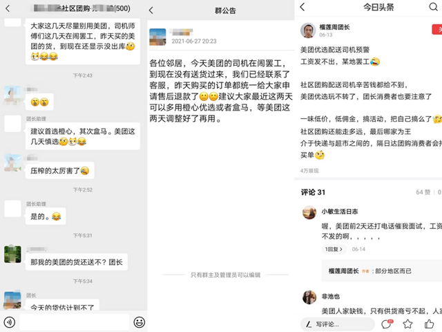 6月27日,一名美團(tuán)優(yōu)選的團(tuán)長在微信群內(nèi)發(fā)出通知:各位鄰居,美團(tuán)司機(jī)停工,貨還沒送來。他已聯(lián)系美團(tuán)客服,全部退單處理,等美團(tuán)調(diào)整好了再用。