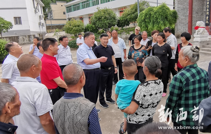▲陜西省慈善協(xié)會(huì)會(huì)長(zhǎng)吳前進(jìn)、陜西鴻瑞投資集團(tuán)有限公司董事長(zhǎng)王世春等看望南坡村群眾。(王順利攝)