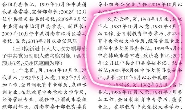 其簡歷這樣寫道:“孫云峰,男,1963年4月生,韓城市人,1983年10月入黨,1981年8月參加工作,全日制教育中專學(xué)歷,在職教育中央黨校大學(xué)學(xué)歷,經(jīng)濟(jì)管理專業(yè),現(xiàn)任中共大荔縣委書記。1999年5月任中共韓城市委常委、政法委書記;2002年12月任中共合陽縣委副書記、紀(jì)委書記;2005年8月任中共大荔縣委副書記、縣長;2010年6月以后任現(xiàn)職。”