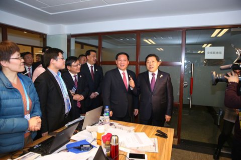 12月16日傍晚,在第二屆世界互聯(lián)網(wǎng)大會(huì)召開期間,國(guó)家互聯(lián)網(wǎng)信息辦公室魯煒主任與浙江省人民政府李強(qiáng)省長(zhǎng)在指揮中心看望組委會(huì)工作人員,為他們的工作“點(diǎn)贊”。謝偉鋒 攝