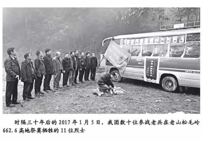 上午9點,“662.6高地”云霧繚繞,山河寂靜,祭奠活動在低徊的哀樂中進行,11位烈士的遺像懸掛在車體上部,十分醒目。戰(zhàn)友們集體為烈士鞠躬默哀,每位戰(zhàn)友也分別向烈士敬獻了煙酒,述說埋藏三十年的心里話。整個祭奠儀式莊嚴肅穆,表現出戰(zhàn)友們對烈士的深切懷念和無限敬仰之情!