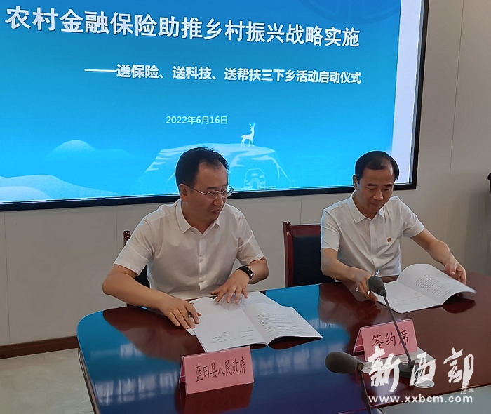 活動由西安市金融工作局、人保財險西安市分公司、陜西各大融媒體平臺、藍田縣人民政府聯(lián)合開展,旨在推進金融業(yè)服務鄉(xiāng)村振興相關工作,豐富鄉(xiāng)村精神文化生活,提升農(nóng)民文化素養(yǎng),促進鄉(xiāng)村產(chǎn)業(yè)轉(zhuǎn)型升級。在三夏大忙之際,把農(nóng)民需要的科技培訓、保險服務、以及急需的物資送到田間地頭,送到農(nóng)民心中。藍田縣人民政府與人保財險西安市分公司在縣政府簽訂了戰(zhàn)略合作協(xié)議。