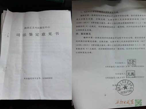 李應(yīng)茹認(rèn)為榆林市第一醫(yī)院在診療過程中存在錯(cuò)誤,因此委托陜西文星律師事務(wù)所通過陜西正義司法鑒定中心,于2015年9月8日進(jìn)行了司法鑒定。認(rèn)定結(jié)果為:榆林市第醫(yī)院在劉洋的疾病診療過程中存在過錯(cuò),劉洋眼睛損傷符合一級(jí)傷殘,劉洋的后續(xù)治療費(fèi)用以實(shí)際發(fā)生為準(zhǔn)。