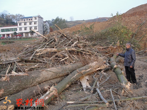 今年11月15日,村干部找到他商討征地樹木和地表附著物補(bǔ)償一事,村干部讓他拿出這幾年投資清單和賠付的具體數(shù)字。16日一大早,他就把這幾年的投資清單送到村支書黨繼才家,在返回的過程中,就看到有一二百不認(rèn)識(shí)的人開著機(jī)器、拿著伐木工具在我的樹林里亂砍亂伐我擋也擋不住,我就報(bào)了警,當(dāng)?shù)嘏沙鏊鶃砣酥皇钦f,讓我配合工程項(xiàng)目。第二天又來了幾百人,竟連伐的樹全部拉走了,比強(qiáng)盜還惡。