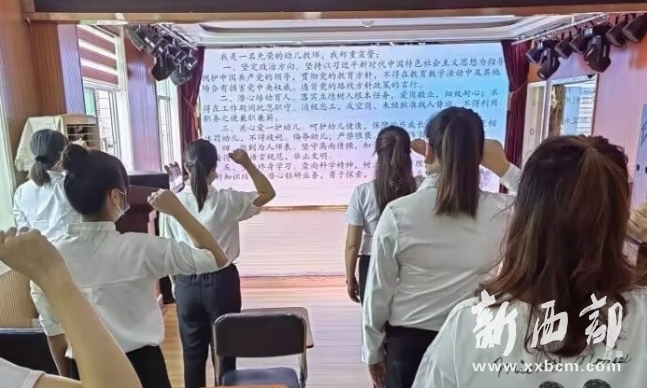商南縣東崗幼兒園教師們?cè)凇稏|崗幼兒園師德承諾書》、《東崗幼兒園教師有償家教承諾書》上鄭重地簽下了自己的姓名。隨后,全體教職員工堅(jiān)定地舉起右手,重溫師德誓言。我們誓將師德師風(fēng)建設(shè)進(jìn)行到底,用優(yōu)良的品行引領(lǐng)教育教學(xué),用過(guò)硬的道德喜迎黨的二十大。