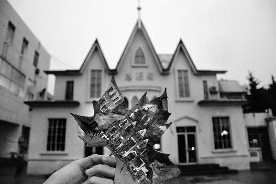 樹葉上畫著校園某處的風(fēng)景