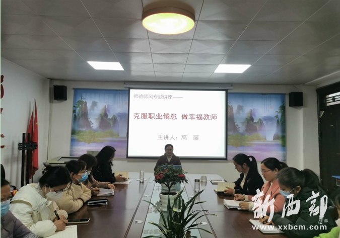 為提升教師隊(duì)伍素質(zhì),塑造教師健康、陽光、積極向上的精神面貌,陜西省商洛市商南縣城關(guān)第六小學(xué)于近日開展題為“克服職業(yè)倦怠做幸福教師”的專題講座活動(dòng)。講座由副校長(zhǎng)高麗同志主講,全體教師參加。
