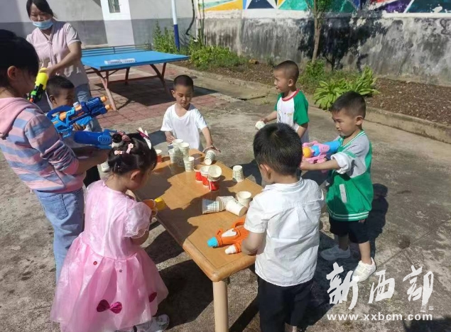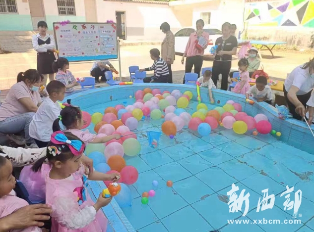 小班組教師提前布置好場地并準備了水槍、氣球、海洋球、漁網、釣魚玩具、紙杯等材料,邀請幼兒開展水上清涼一夏活動,如:歡樂運水球、水中撈珠、快樂傳遞、吹海洋球、釣小魚、水上大作戰(zhàn)。通過此次活動,不僅滿足了孩子愛玩水的天性,而且讓孩子們在與水親密接觸的過程中,享受“六·一”的歡樂。