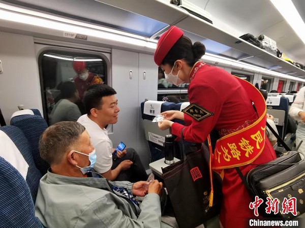 7月1日,青藏鐵路西格段首發(fā)列車上,列車員們給乘客分發(fā)紀(jì)念品。 中新社記者 祁增蓓 攝