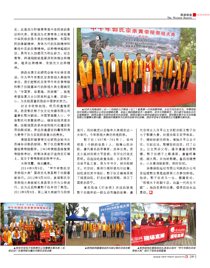 2014年中秋節(jié),來自陜西、川渝、江西、貴州、河南、山西、福建、廣東、貴州、云南、浙江、江蘇、甘肅等省(市)的郭氏宗親代表200余人聚首橋山,隆重舉行“甲午年郭氏宗親黃帝陵祭祖大典”。