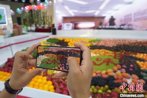 圖為參觀者手機(jī)拍攝用農(nóng)產(chǎn)品拼裝的“甘味”。(資料圖) 九美旦增 攝