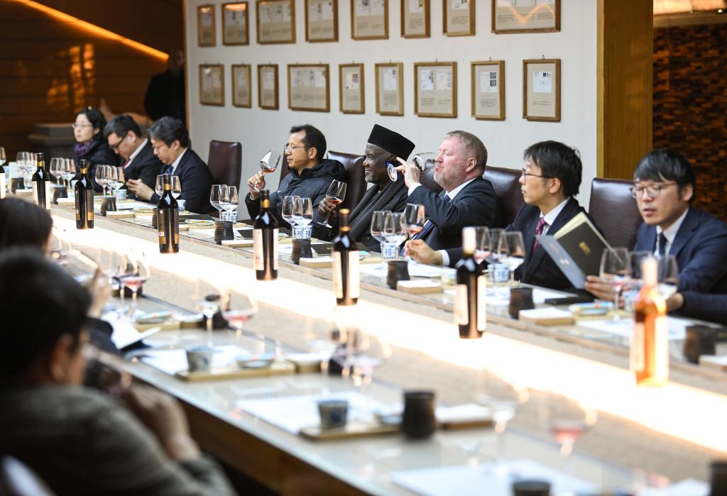 ▲駐華使節(jié)在寧夏銀川市參加賀蘭山東麓葡萄酒品鑒會(11月21日攝)。新華社記者 馮開華 攝