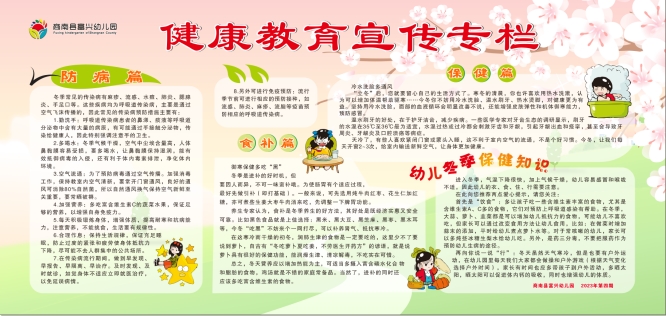 通過系列活動的開展,使全體師幼掌握了預(yù)防冬季傳染病的基本方法,增強了自我保護(hù)意識,確保了幼兒園保教工作的正常開展。今后,我園將一如既往的開展好健康教育活動,繼續(xù)加大衛(wèi)生健康知識宣傳力度,為孩子們創(chuàng)設(shè)“安全、健康、快樂”的成長環(huán)境。(邢云存)