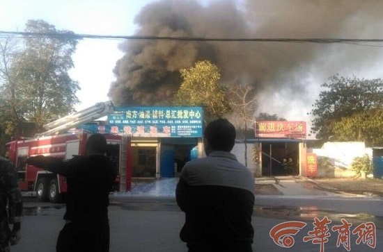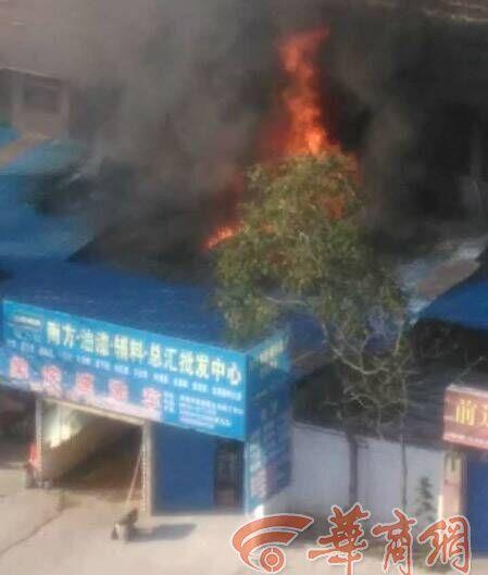 10月10日下午4時(shí)50許,渭南市城區(qū)前進(jìn)路北頭一油漆批發(fā)中心突發(fā)大火,黑色濃煙騰起百米高,無(wú)人員被困,五輛消防車(chē)先后趕到現(xiàn)場(chǎng)滅火。