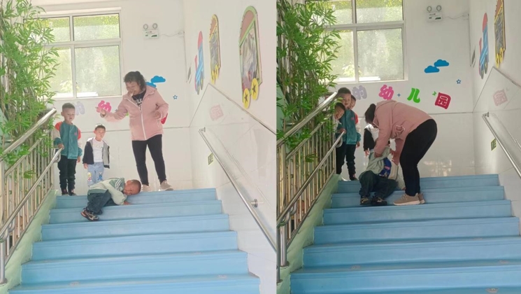 場(chǎng)景二:在樓道拐彎處,幼兒跌倒,當(dāng)幼兒發(fā)現(xiàn)自己前