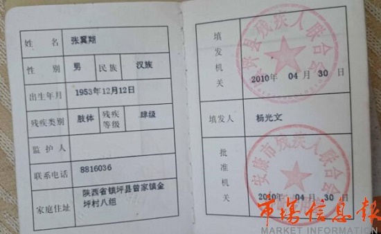 張翼翔告訴記者,在辦理殘疾證時(shí),民政局曾把之前他們上交的傷殘證明原件上的傷殘等級(jí)涂抹掉。一部分人把210元的辦證費(fèi)用直接交到縣殘聯(lián),殘聯(lián)沒有給他們開正規(guī)發(fā)票,且沒有經(jīng)過醫(yī)院檢查,殘聯(lián)就把他們的傷殘等級(jí)降了一級(jí)。