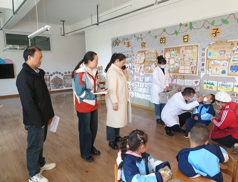 演練活動模擬了午餐后3到4名幼兒出現(xiàn)惡心、嘔吐、腹痛等疑似食物中毒癥狀的情景。當(dāng)班級教師發(fā)現(xiàn)異常情況后,立即停止用餐活動,將“不適幼兒”帶離就餐區(qū)域,并第一時間上報園領(lǐng)導(dǎo)與保健室。園領(lǐng)導(dǎo)迅速啟動了食品安全應(yīng)急預(yù)案,保健醫(yī)生攜帶應(yīng)急醫(yī)療箱飛速趕到現(xiàn)場,有條不紊地對“患兒”進行初步身體檢查、癥狀記錄及必要的急救處理,對幼兒進行安撫。
