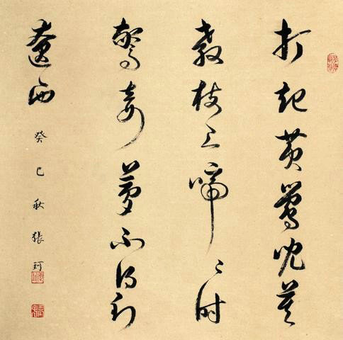張珂先生極少以草書(shū)示人,但不少人卻對(duì)他的草書(shū)如醉如癡。每遇鍥而不舍求字者,他總是自謙地說(shuō):“還是寫(xiě)行楷吧,對(duì)付著能把字寫(xiě)對(duì)。散之先生六十歲后才學(xué)草書(shū),于右任先生也是到人到中年方開(kāi)始習(xí)草,我的草書(shū)連初學(xué)都算不上呢?!北M管如此,在感佩張珂先生治學(xué)嚴(yán)謹(jǐn),取法乎上的同時(shí)。我卻認(rèn)為他的草書(shū)雖然比大師前賢有一定距離,但也足以自成面目,獨(dú)具風(fēng)神了。
