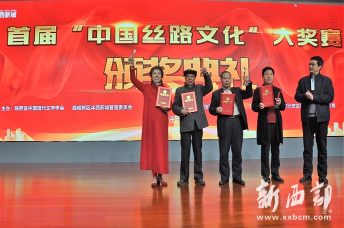 ▲王澍宇(左二)作品《茶都風(fēng)云》榮獲“首屆中國(guó)絲路文化大獎(jiǎng)賽”一等獎(jiǎng)(圖片由王澍宇提供)