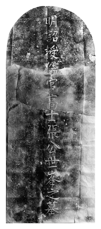 在村南的一座水井旁,我們見到了一塊斷成三節(jié)的石碑,這是我小時(shí)候常在上面玩耍的老朋友。上面的字記不清了,我們?nèi)齻€(gè)人合力翻起石碑。沒想到,卻有了一個(gè)重大的發(fā)現(xiàn)。只見碑刻正中是“明詔授儒官高士張公世峰之墓”,右側(cè)是“賜進(jìn)士奉政大夫、刑部尚書、前南京吏兵部二部尚書李世達(dá)題”左側(cè)是“萬歷己丑八月初九日,不肖孤翙之、翀之、孫起□、起巖、起蛟、起龍、起鹍泣血立”。