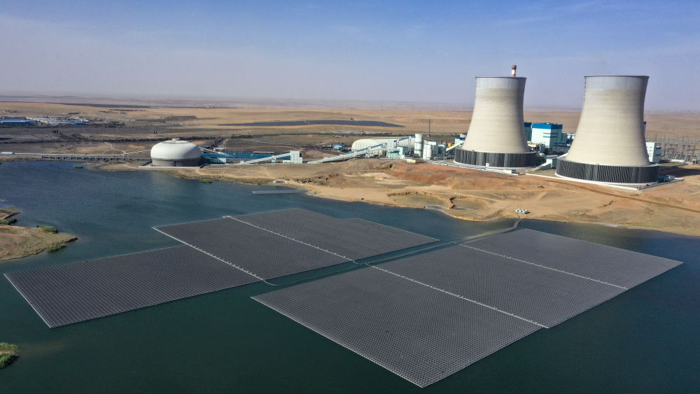 ??國家能源集團寧夏電力公司寧東電廠3×5.98兆瓦漂浮分布式光伏發(fā)電項目全景(無人機照片,2022年6月17日攝)。新華社記者 王鵬 攝